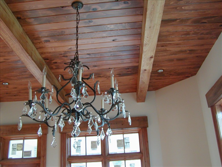 Beautiful stained Common Cypress V-Joint ceiling and 6x10 beams