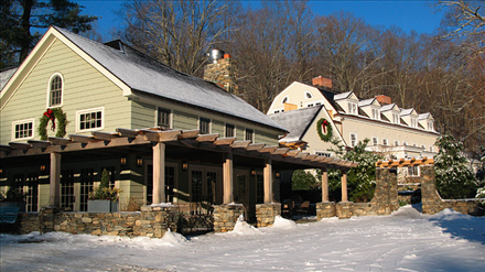Common Cypress shade arbor & porch on historic farmhouse in New York